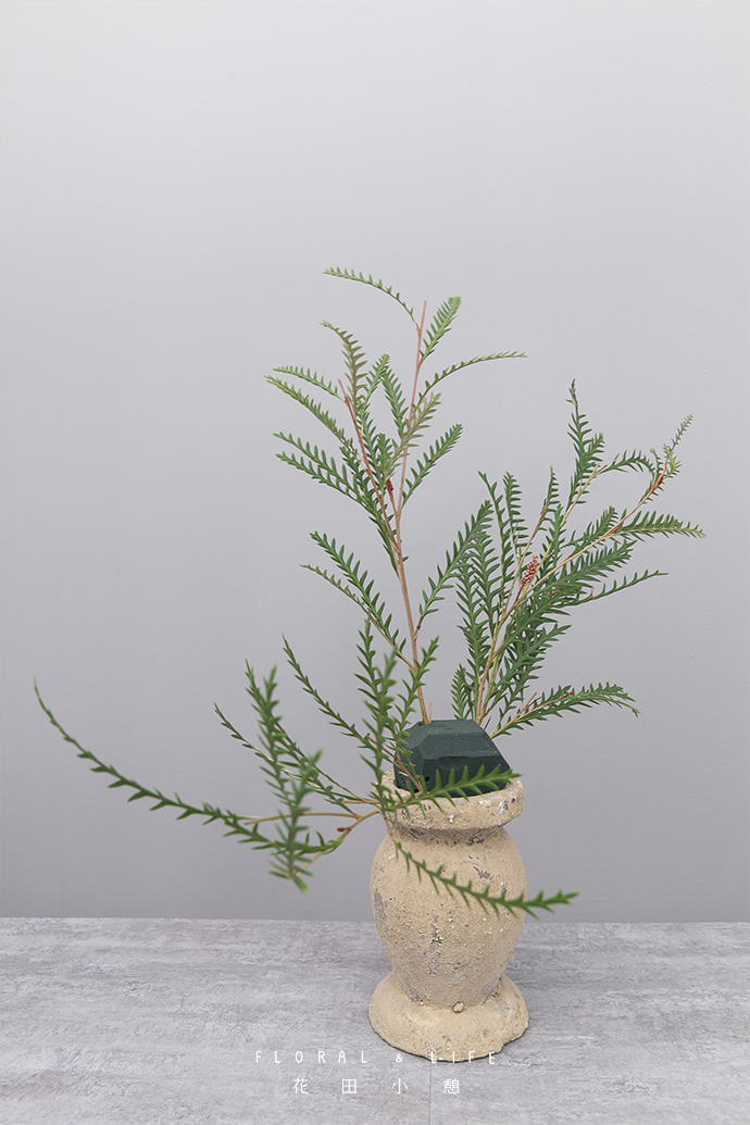 将泡好的花泥置于瓶内,花泥高出瓶口适宜高度并削去棱角。以三角形的方式插入3支南非叶,勾勒出作品的大致轮廓。