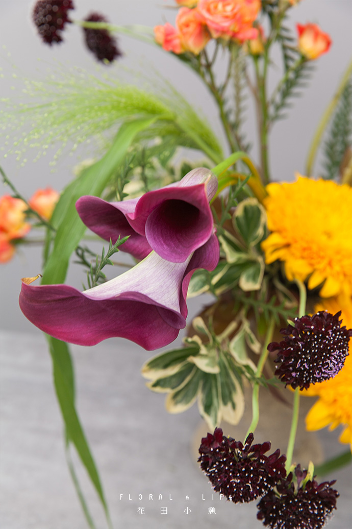 在接近瓶口的地方一高一低插入两支芙蓉向日葵,成为作品的焦点花。
