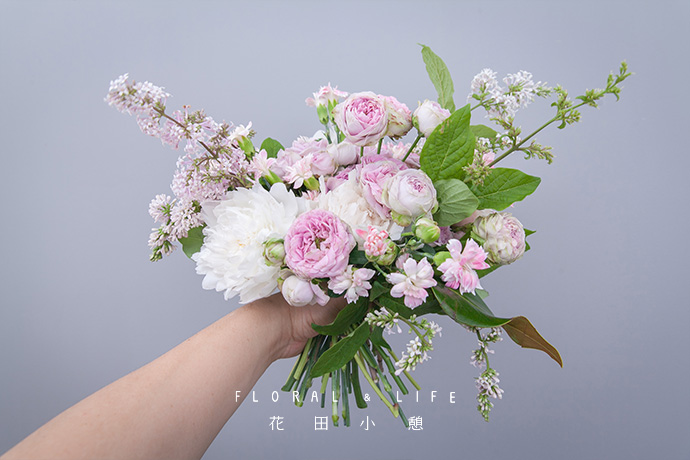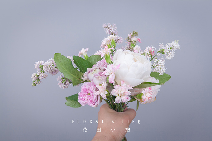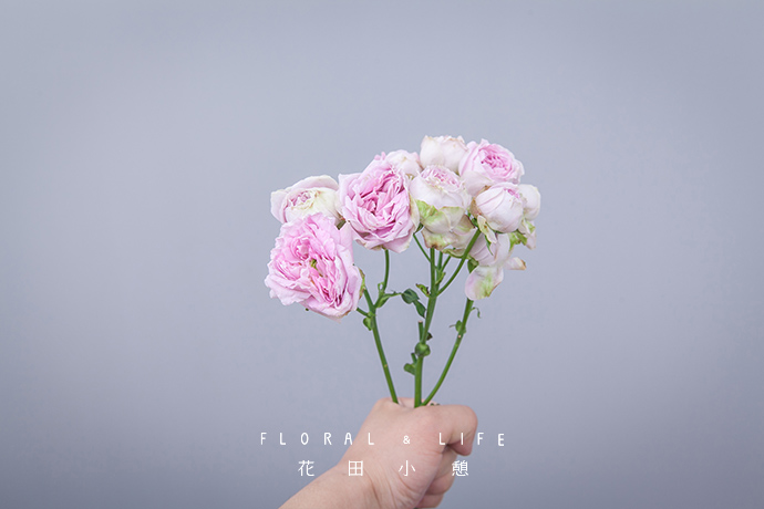 为了方便大家在花材搭配时的选择,花田小憩APP特设香味等级图谱,供大家在学习过程中了解更多植物的属性,以方便作品选择更适合的空间位置陈列。将一支粉红泡泡握在手中心,作为花束的中心。