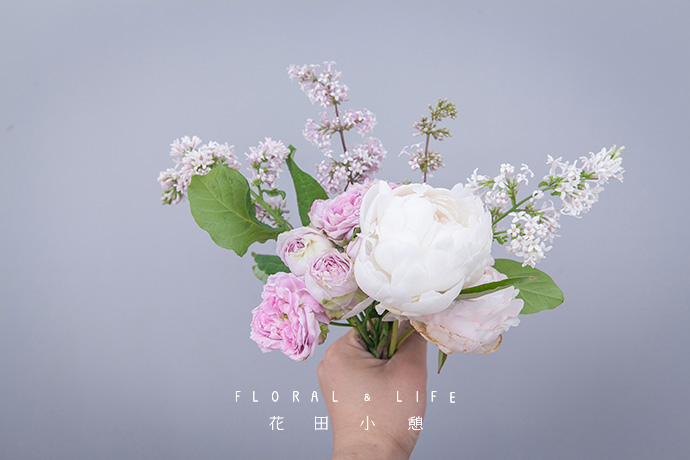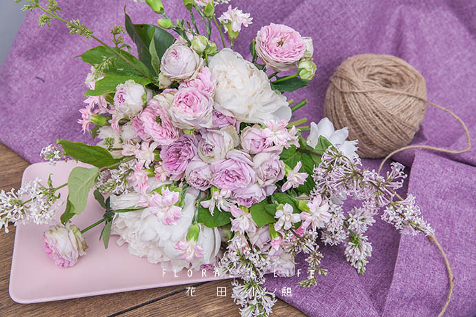 加入丁香花,位置高于粉红泡泡,展现丁香花线条自然美。