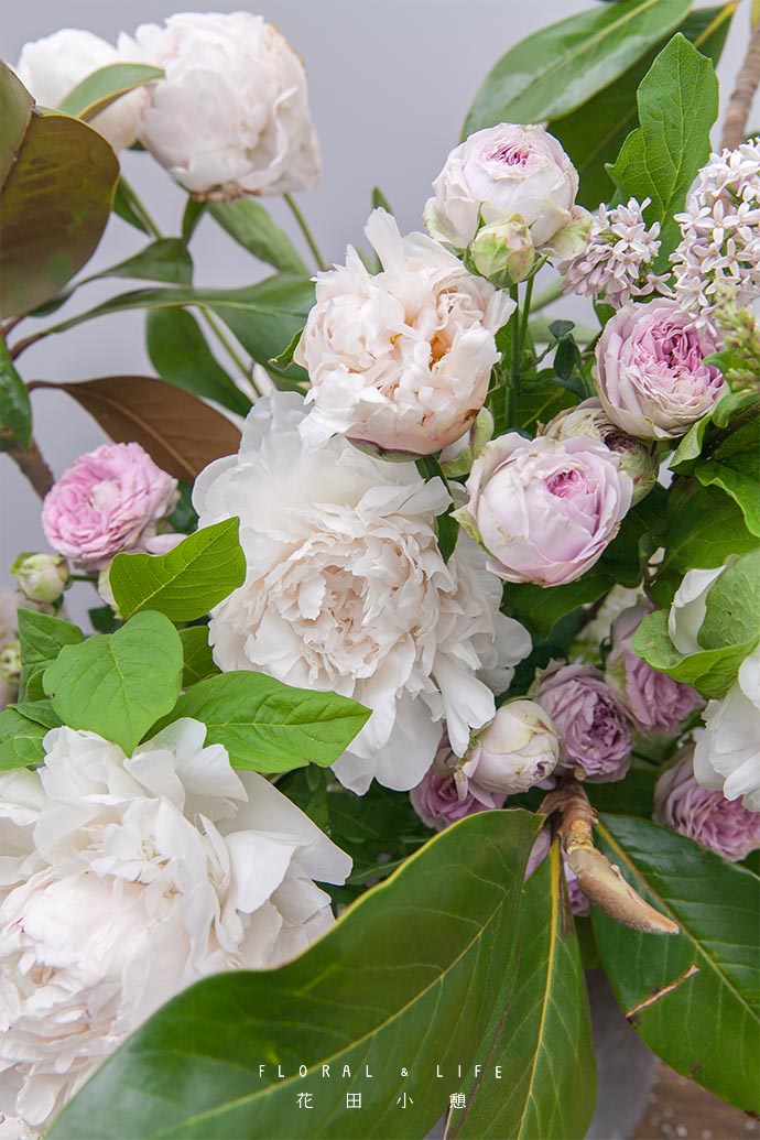 在空隙较多的地方插入珍珠梅,丰富作品层次。陆续加入粉红泡泡,花材之间注意空气感。