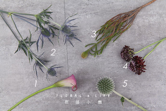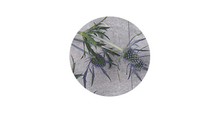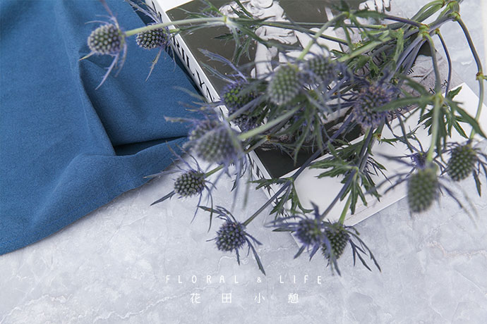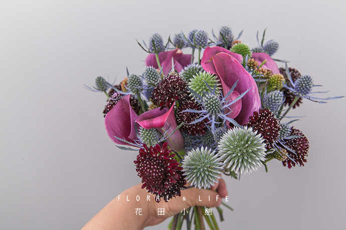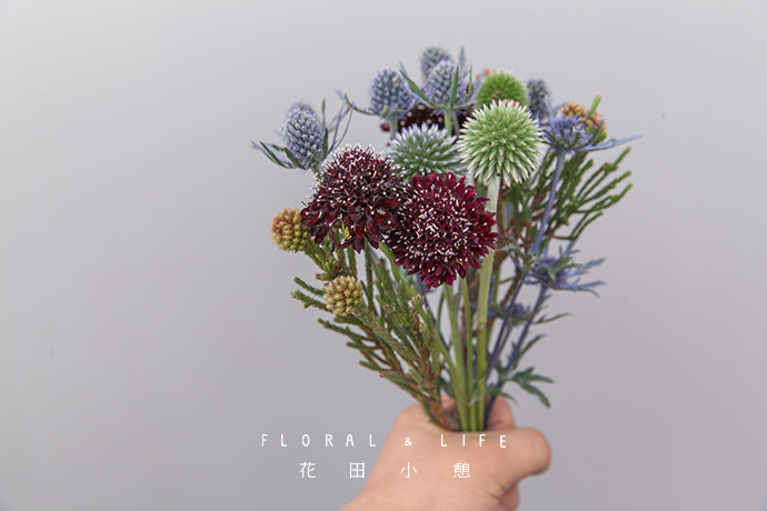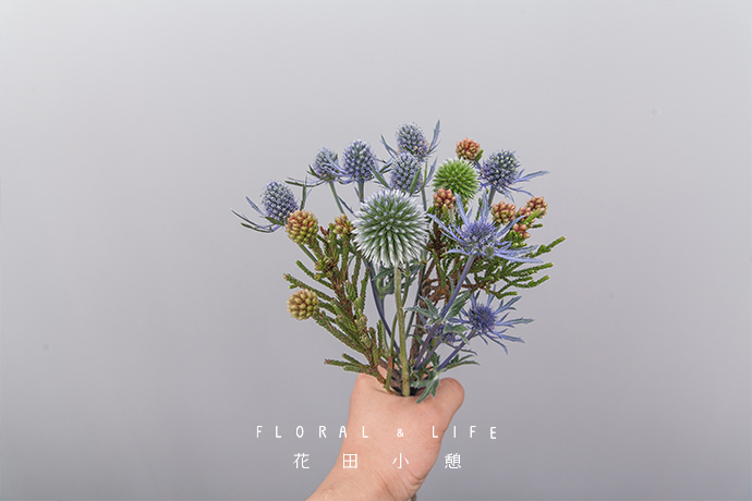 将几支质感硬朗的刺芹、星团草、蓝刺头握于手中,作为花束的中心。