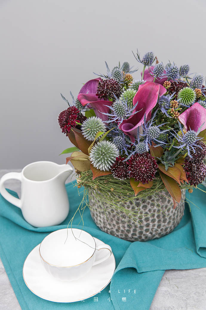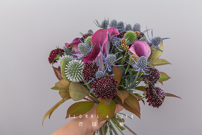 陆续加入马蹄莲和蓝盆花丰富作品的层次。古典的配色让作品带有一种陈旧感。