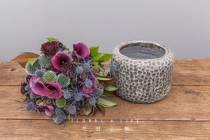 用麻绳捆绑固定,圆形花束制作完成。准备一个复古花器。
