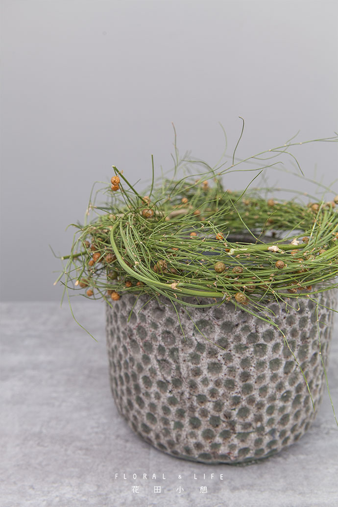 将花田小憩《心中的莫奈花园》作品中缠绕好的香香果重复利用,放置于花器口上,斑驳的花器也成为设计的一部分。