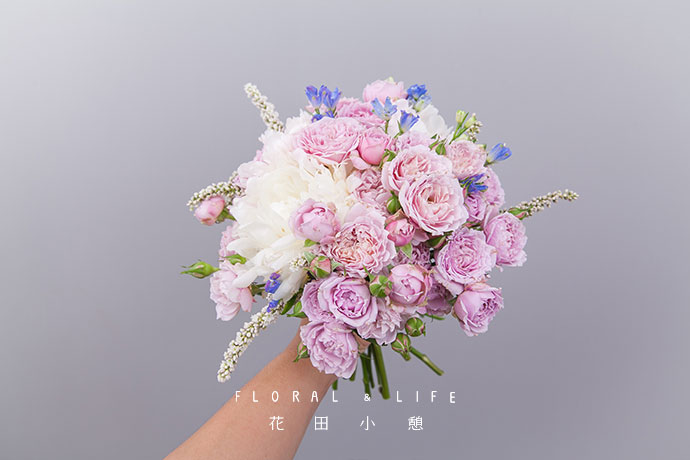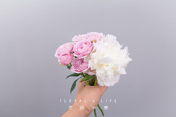 陆续添加香香玫瑰、白廖和小飞燕,形成一个圆形花束。