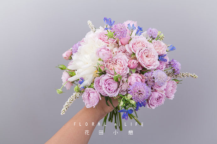 再加入几支蓝盆花,分布整个手捧花中,蓝盆花轻柔纤细,花头位置略高一些。