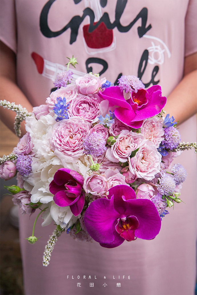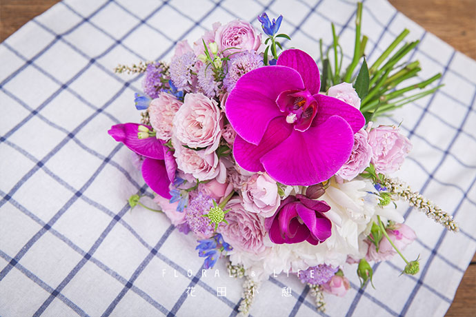 最后在手捧花的表面点缀几支艳丽的粉色蝴蝶兰,强调手捧花气质华丽的同时颜色也过度地非常自然。