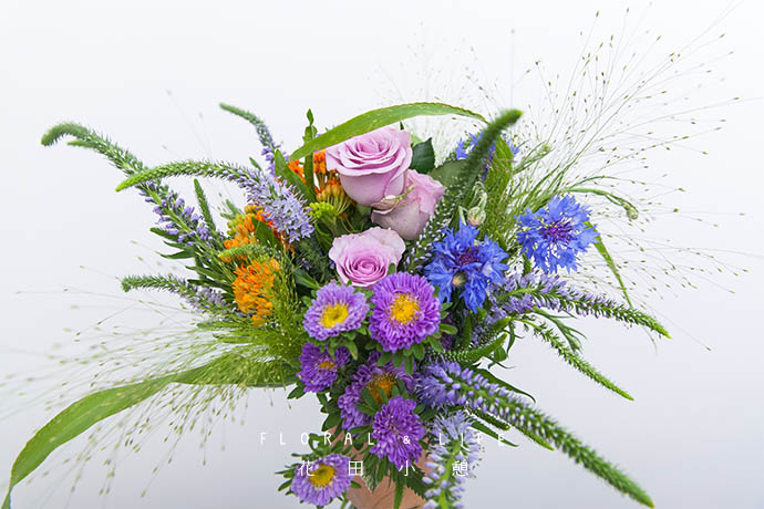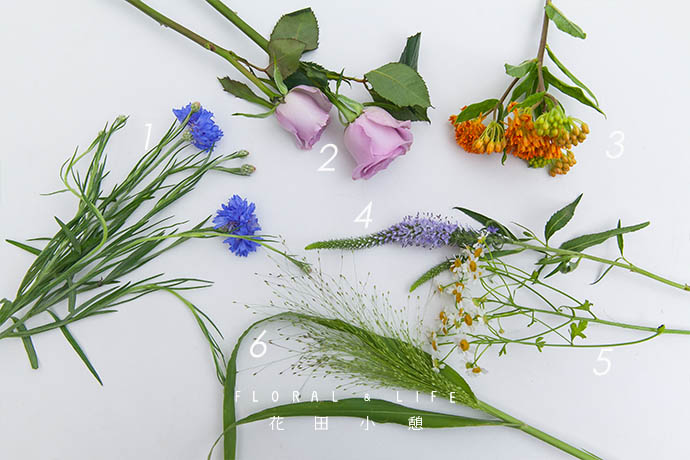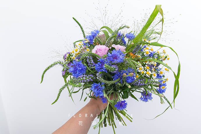 —作品配色—夏季正是植物快速成长的季节,用一些充满生命力的带有韵律感的花草打造自然风格,再以清爽的蓝色花重点点缀,不仅营造了风儿的流通之美,同时也营造出夏日的田野情趣。