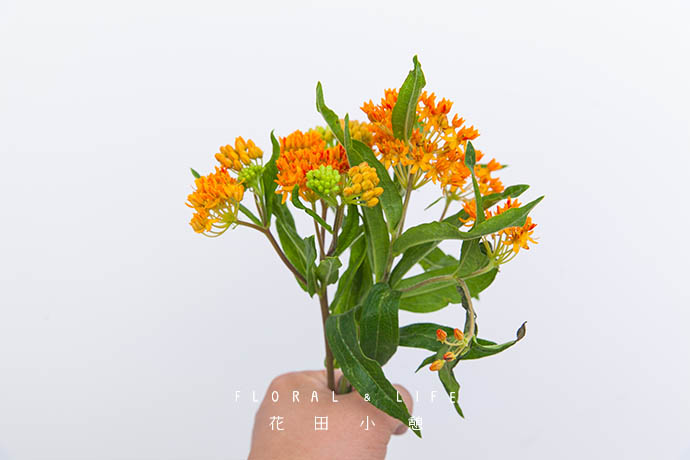 为了方便大家在花材搭配时的选择,花田小憩APP特设香味等级图谱,供大家在学习过程中了解更多植物的属性,以方便作品选择更适合的空间位置陈列。将一支马利筋握在手中,作为花束的中心。