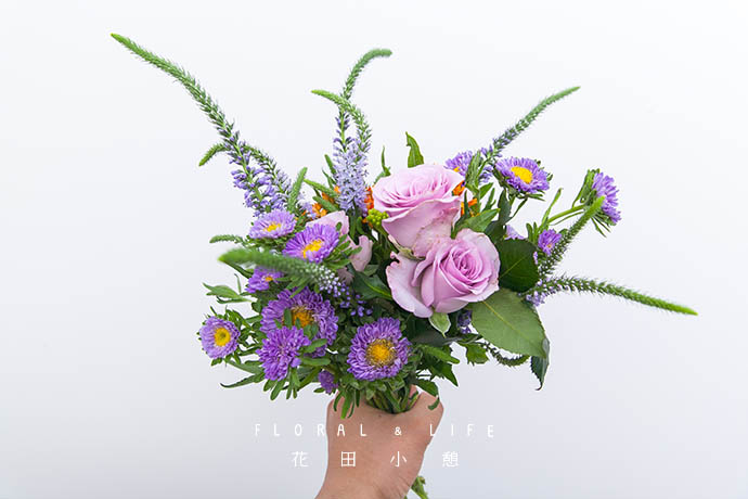 在花束外侧加入翠菊,增加作品体量。