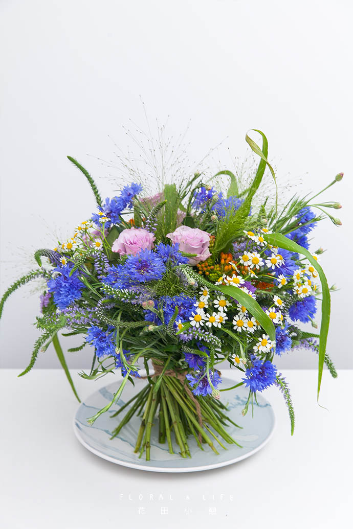 夏季正是植物快速成长的季节,用一些充满生命力的带有韵律感的花草打造自然风格,再以清爽的蓝色花重点点缀,不仅营造了风儿的流通之美,同时也营造出夏日的田野情趣。