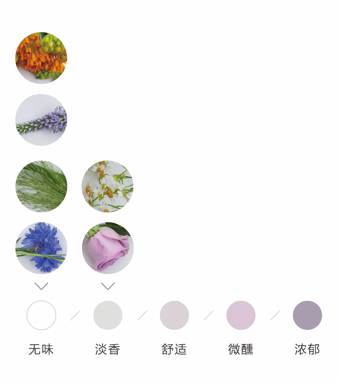 为了方便大家在花材搭配时的选择,花田小憩APP特设香味等级图谱,供大家在学习过程中了解更多植物的属性,以方便作品选择更适合的空间位置陈列。