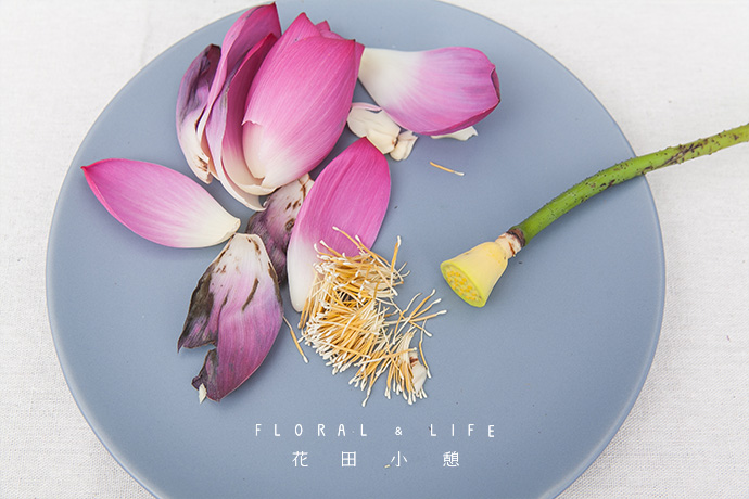 没有了花瓣包裹的莲蓬作为一种新的花材出现,可以重新使用,也可晾作干花长久保存。