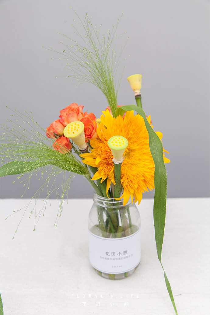 还可以向花瓶中插入类似向日葵、蔷薇这样的黄色花材,形成一个自然风格的瓶花。小莲蓬从主花中跳跃出来,即使成为了配角,也依然掩盖不住它俏皮的可爱模样。