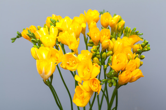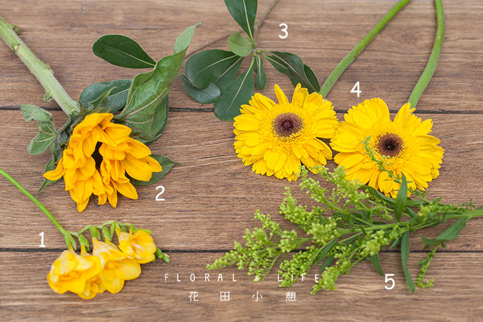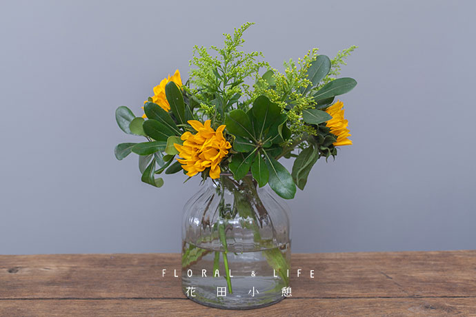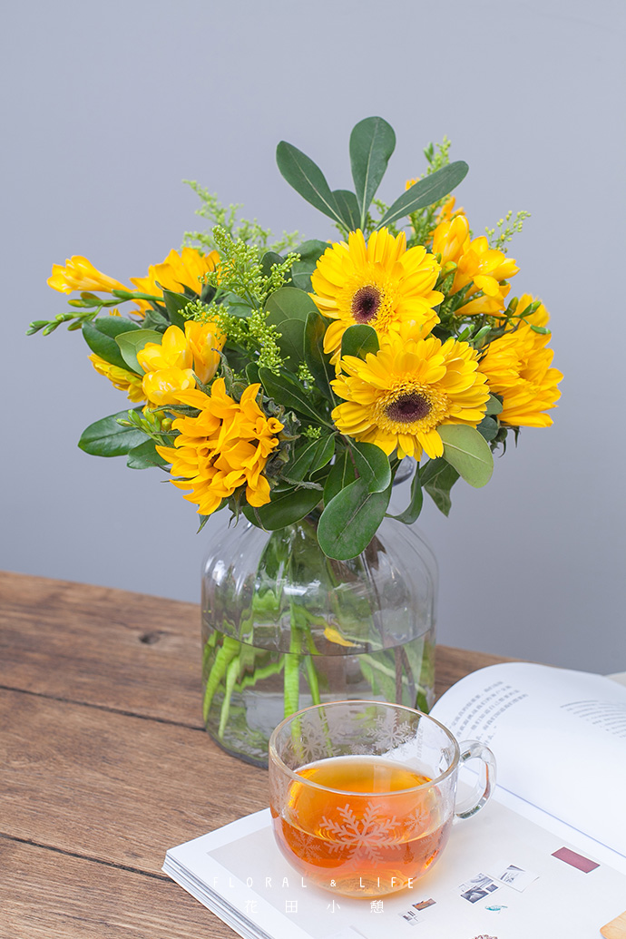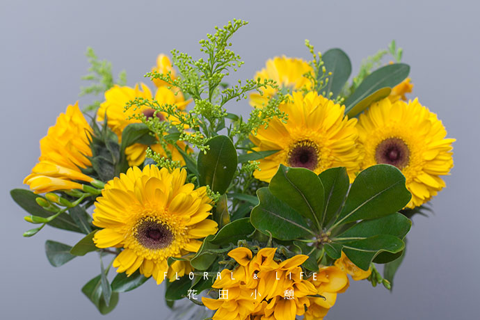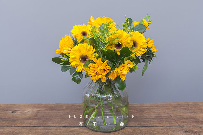向日葵、扶郎、香雪兰,同样色系的三种花材,各自洋溢着不一样的阳光清爽感。