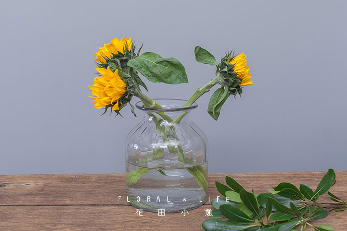 海桐叶错落的插入向日葵的间隙中,使整体更加和谐美观。