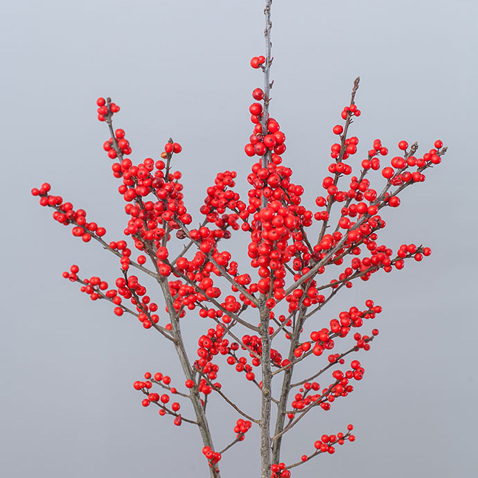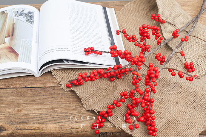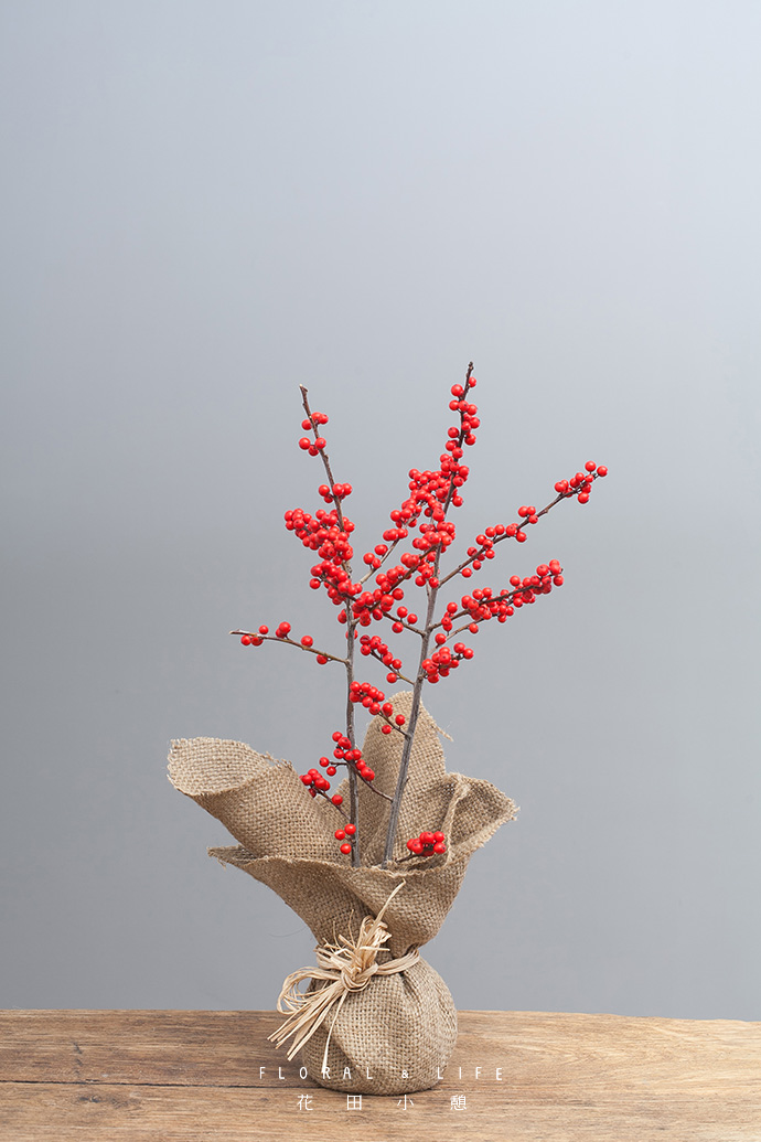 冬青垂直插入花泥,颗颗硕大红润的果实,预示着新的一年的硕果累累,在麻布收口处,用拉菲草系一个大号蝴蝶结,文艺复古。