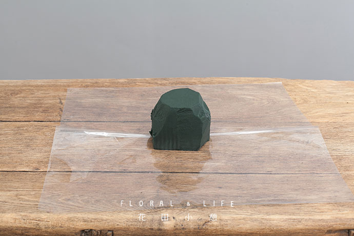 将花泥简单修剪边缘棱角,放置于一张透明玻璃纸中央。