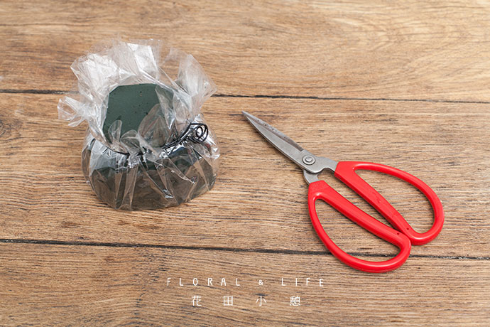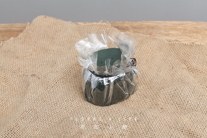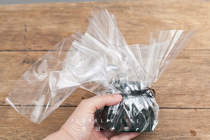 用黑色铁丝将透明玻璃纸缩紧,留出花泥表面。