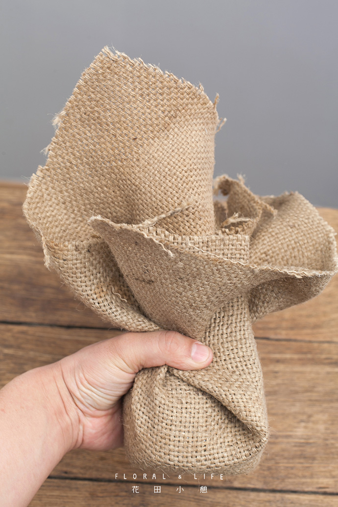 将麻布包裹花泥后收紧。