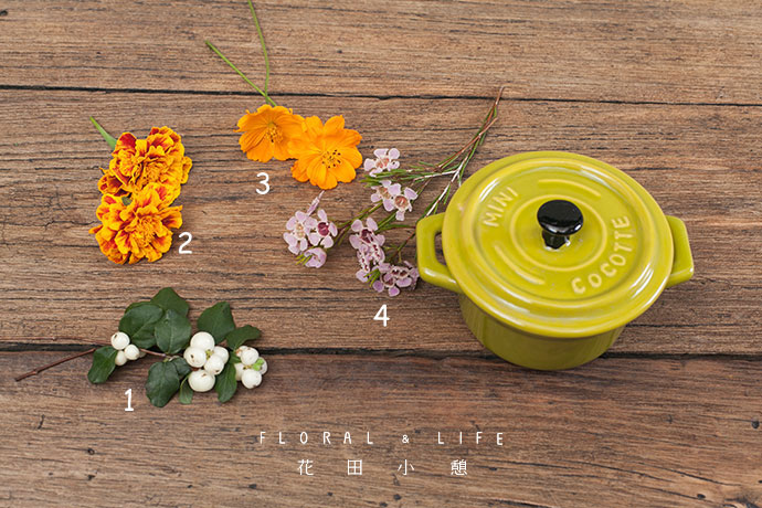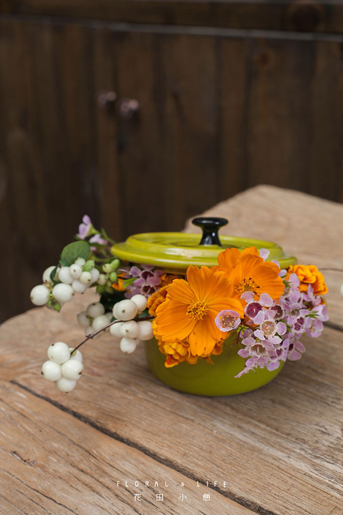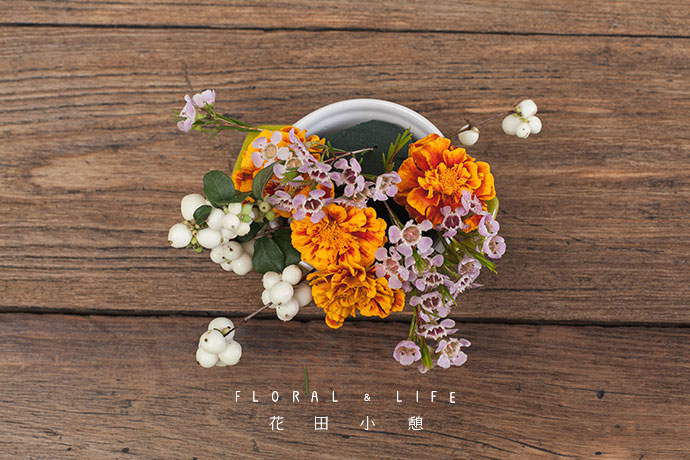 橘色的格桑花插入万寿菊与腊梅之间。格外突显的格桑花与满溢的其他花材,共同营造出3D动画的视觉感,颇为有趣。