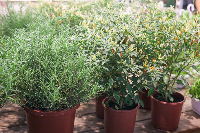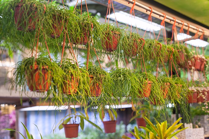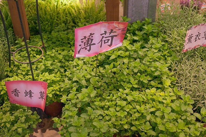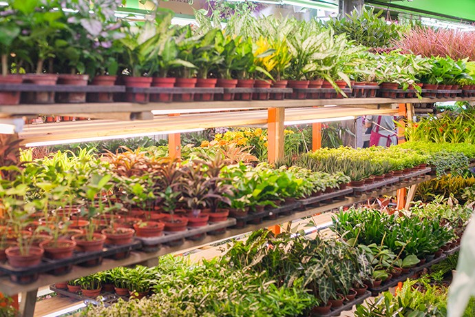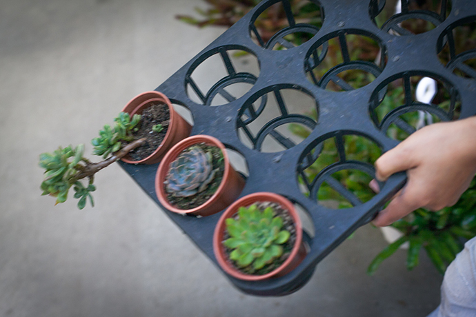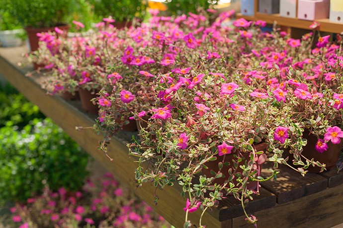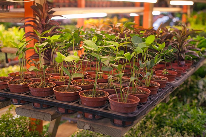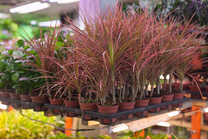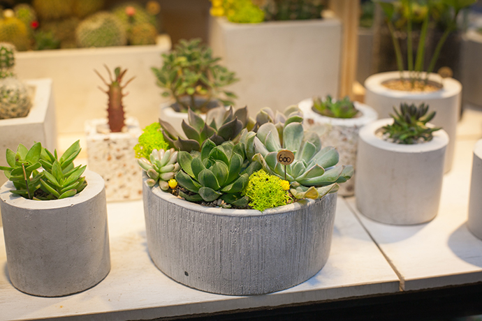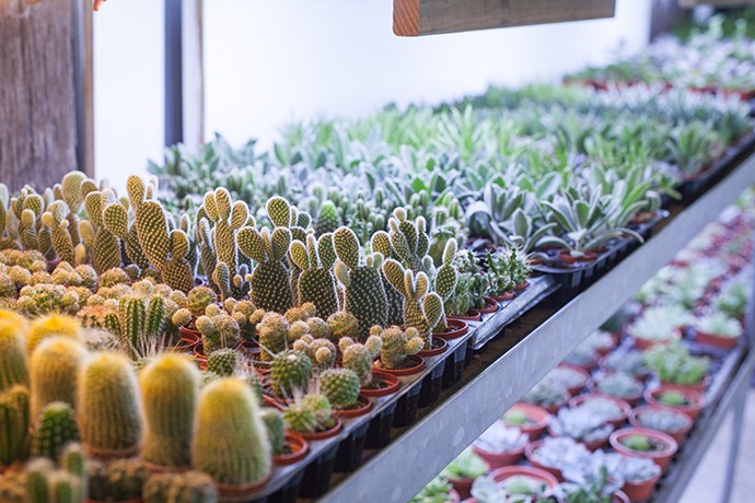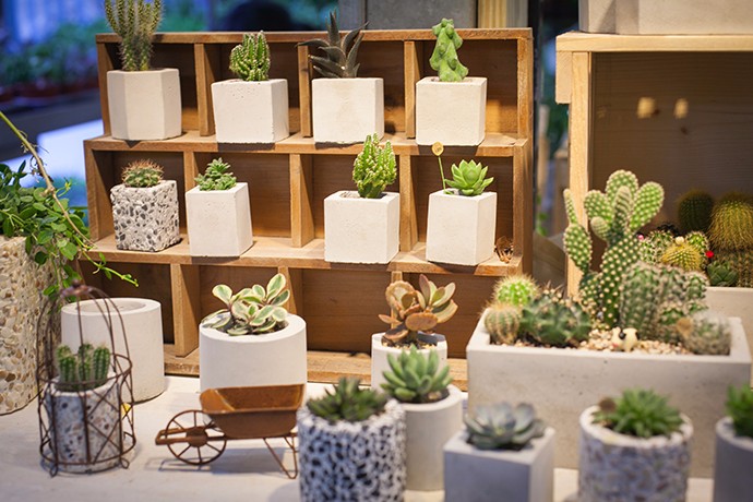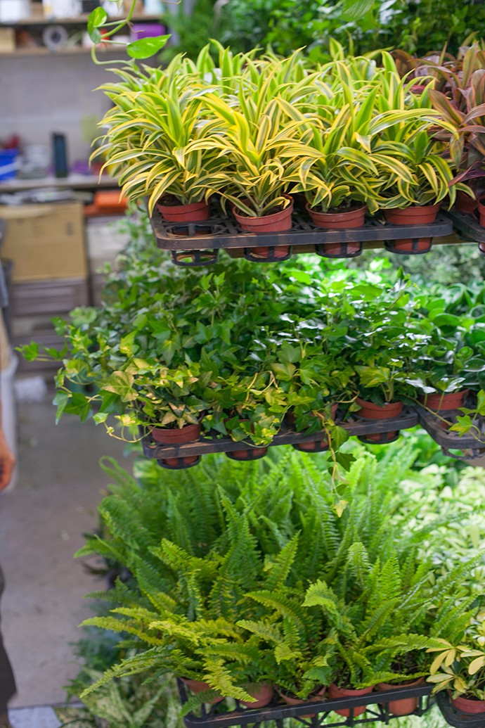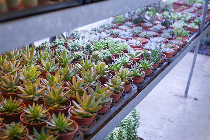 植物被标准化的摆放在货架之上,按照颜色和形态简单分开,看起来更加有层次。