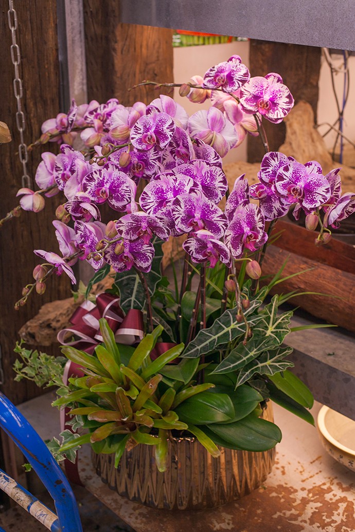 除了蝴蝶兰也会有石斛兰和一些长得像大嘴怪的兜兰,几乎每一次来台湾表演我都会买上一些红红绿绿的“兜兰”作为花材。