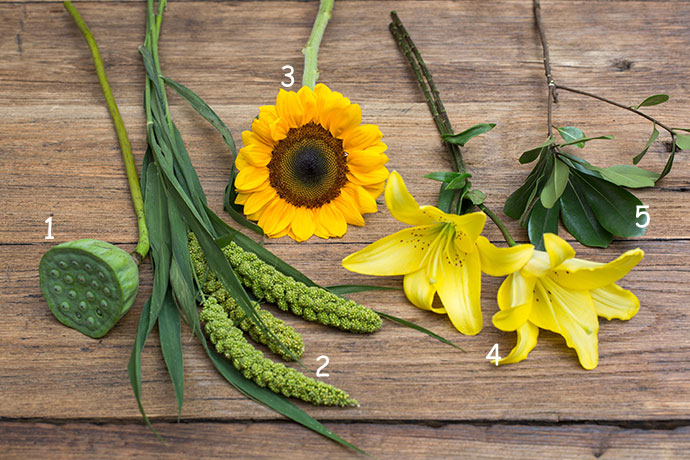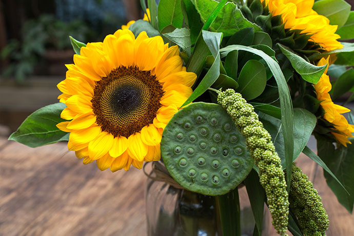 取一只新鲜饱满的莲蓬,搭配在向日葵旁,同样带有大盘花心的两种植物,互相依偎,和谐质感溢于言表。