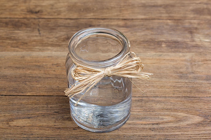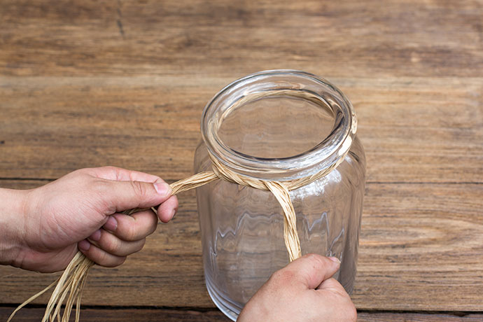 用复古的拉菲绳,以单层麻花型,固定于瓶口处,尾部余出打蝴蝶结的量。