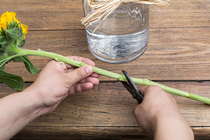 向日葵的枝干较为细长,用花艺剪截取掉一部分,便于插入花瓶后的美观。