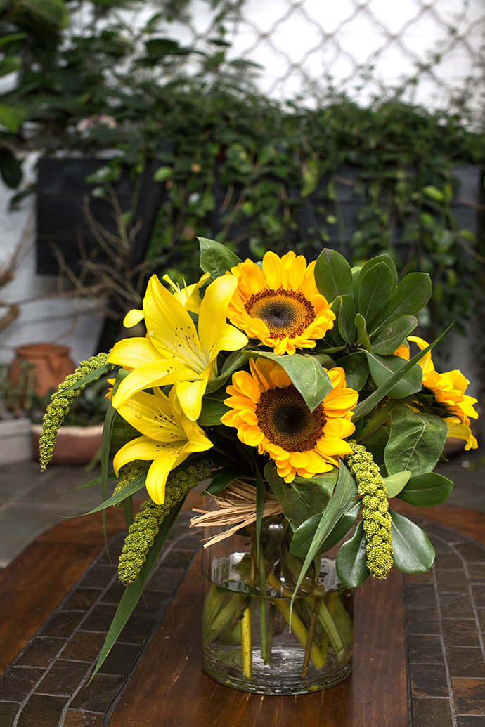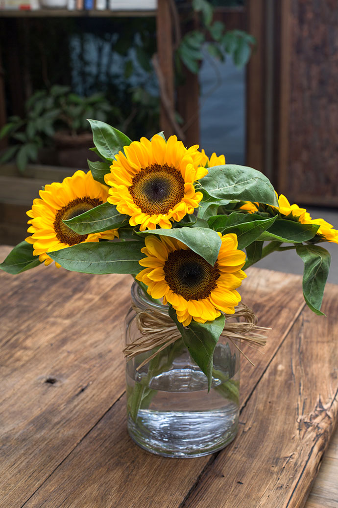 将向日葵交错斜插入花器中,分散开来的向日葵,朝气满满。