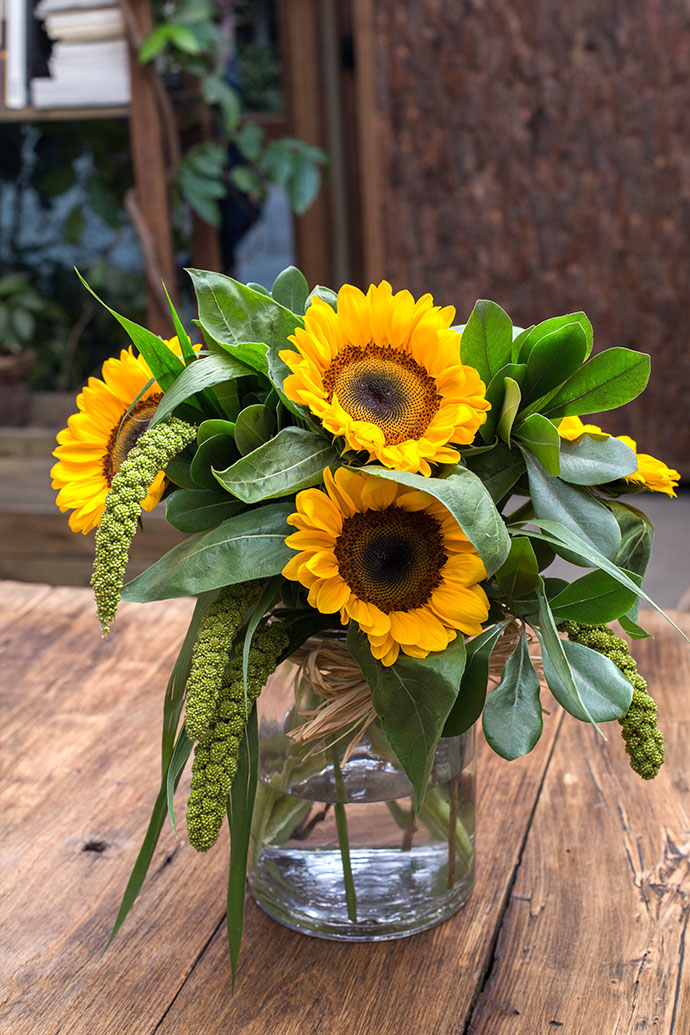 将谷子和修剪好的海桐叶,错落的插入向日葵花束中,橙黄色的向日葵搭配颗粒满满的谷子,朝气蓬勃。