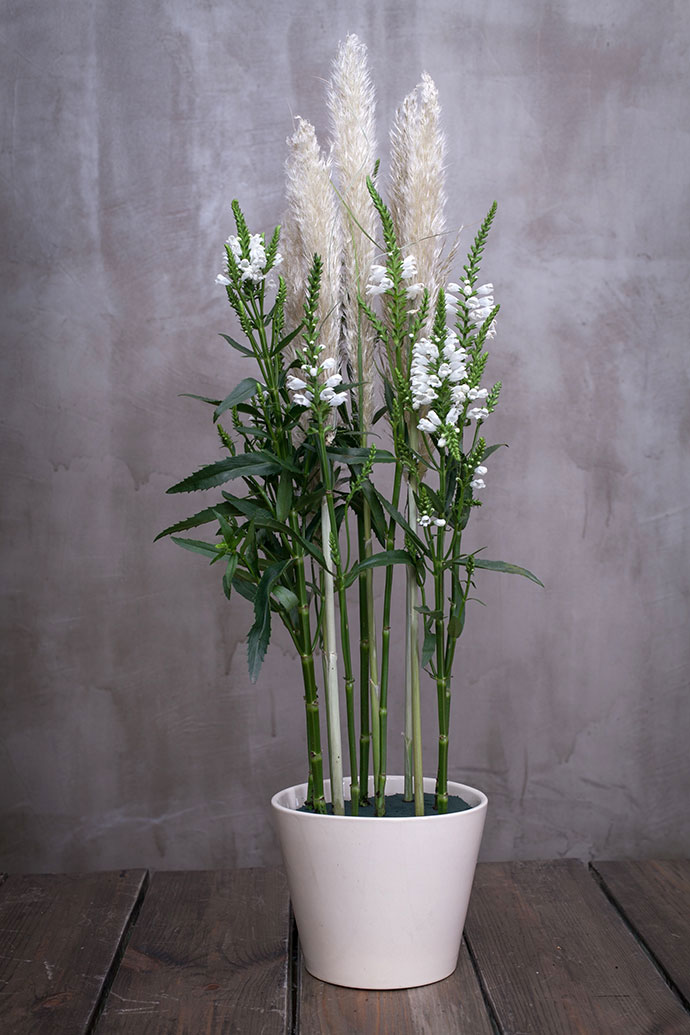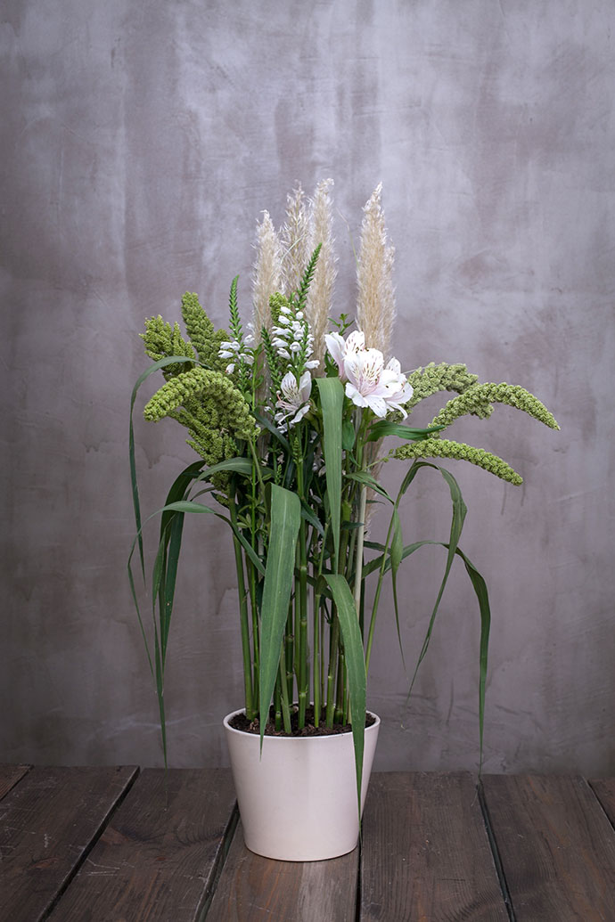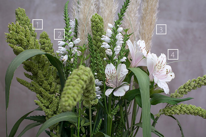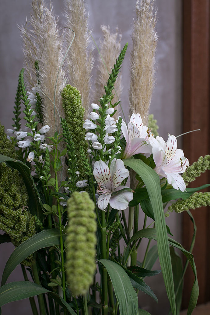 在造型中补入谷子和主花水仙百合,强化造型的焦点区域 .