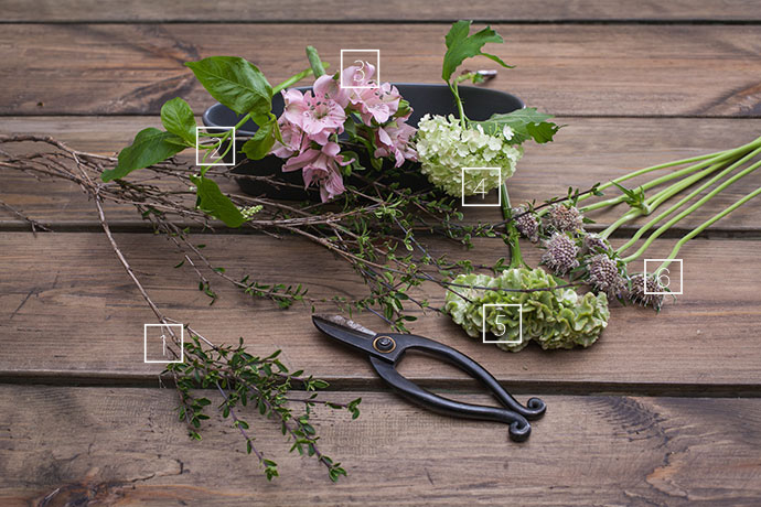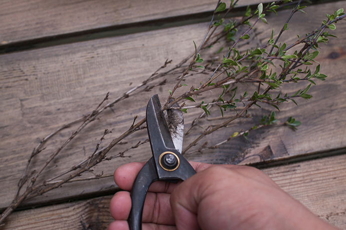对六月雪进行修剪,修剪时应注意“顺应自然”的原则,尽量保留花材本身的天然姿态。