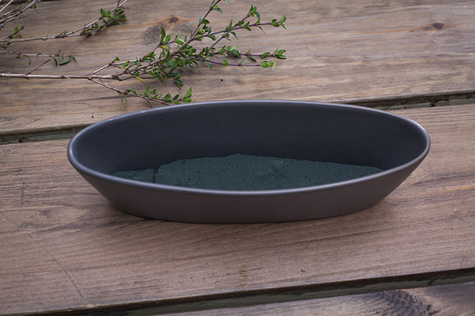 选取一款近似于椭圆形的花器,裁剪出大小样式的花泥放入其中。