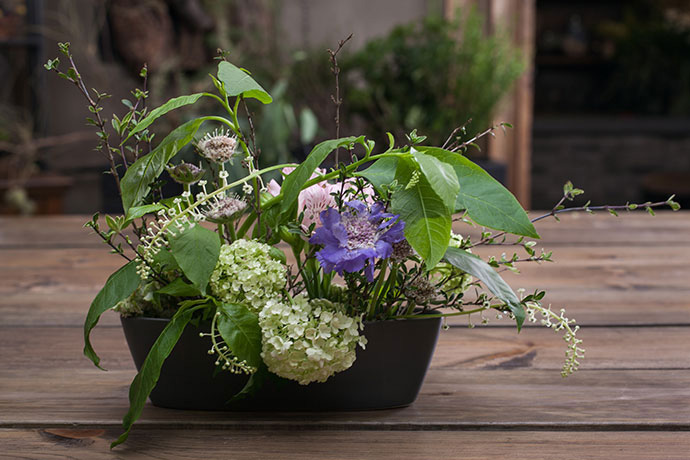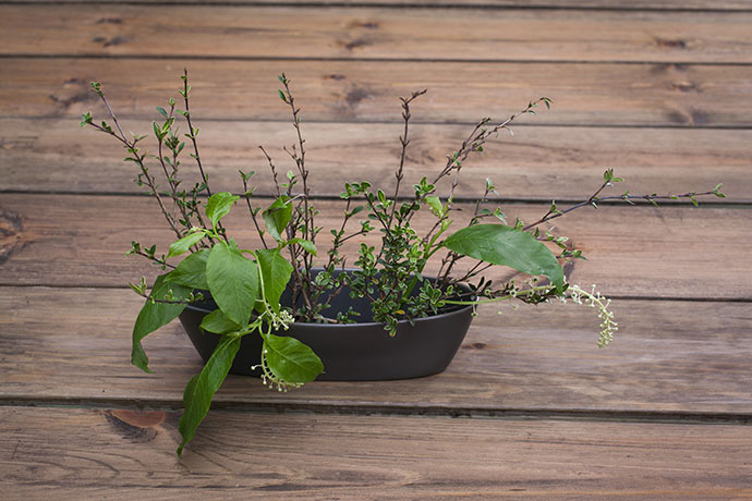 将六月雪直立向上插入容器中,在其周边加入商陆花,给人以端庄稳重的艺术美感。