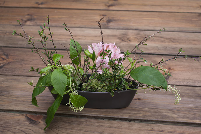 作品的另一侧,插入水仙百合,绿意萌动间绽放着一抹粉红。