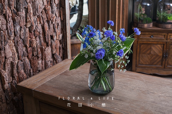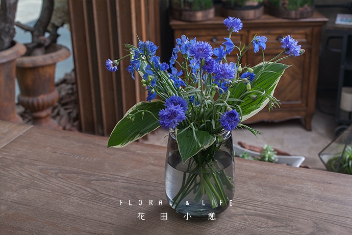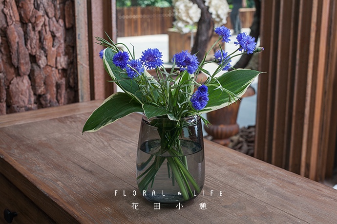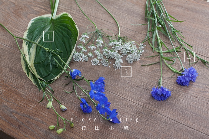 - 作品配色 -1.作品以蓝色的花材作为主要色彩,并通过绿色和白色花材的点缀,以多彩之势呈现出静雅的质感。将花材插制于灰色的