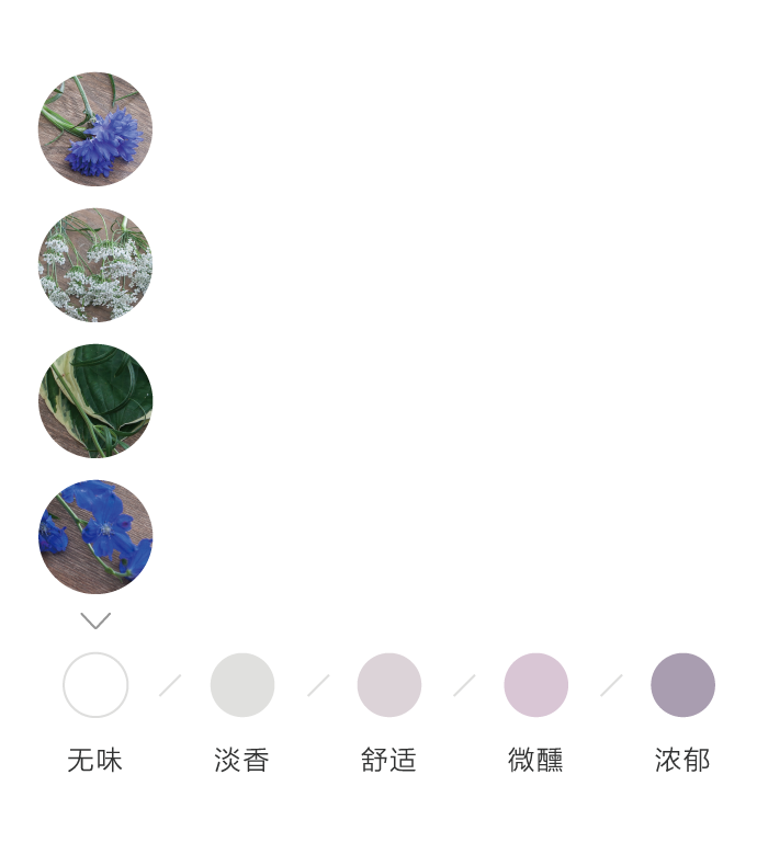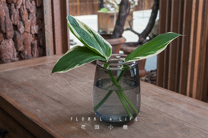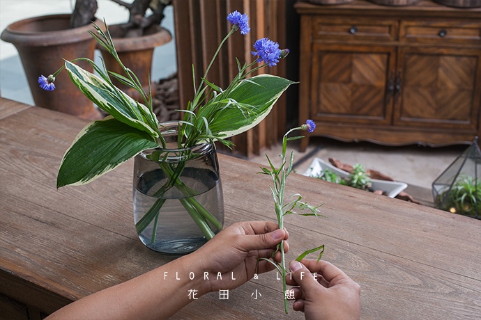 为了方便大家在花材搭配时的选择,花田小憩特设香味等级图谱,供大家在学习过程中了解更多植物的属性,以方便作品选择更适合的空间位置陈列。根据作品的需要,将准备好的玉簪叶针对茎干部分进行适当裁剪,保持高度的一致性,并放置于盛满清水的灰色花器中,便于作品的插制和造型。