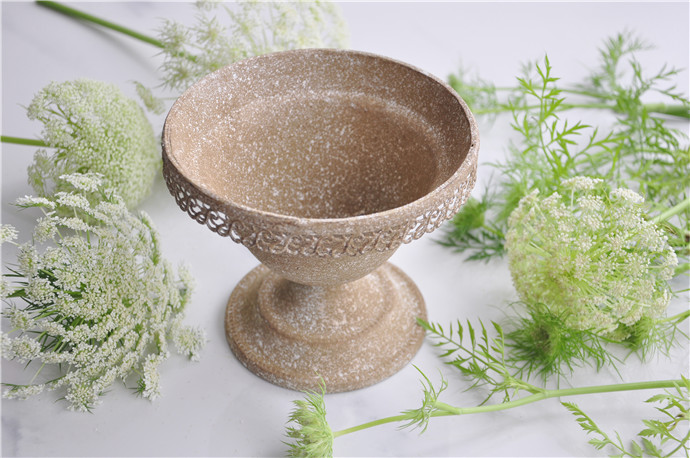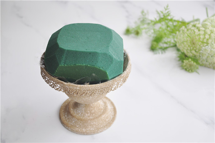 准备花器. 将花泥切割成适合花器的大小固定在花器上,切去花泥表面的棱角,以增加有效的插花面积.这里用到的是铁艺花器,为了防止生锈和漏水,需要在花器和花泥之间隔一层玻璃纸防水.