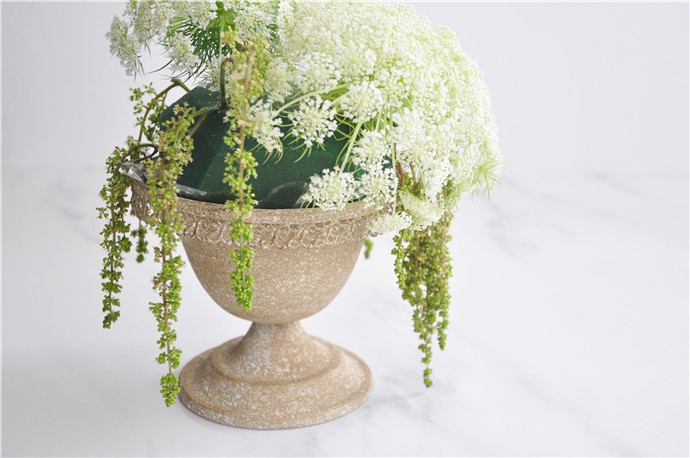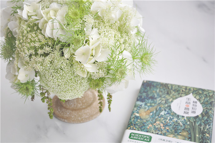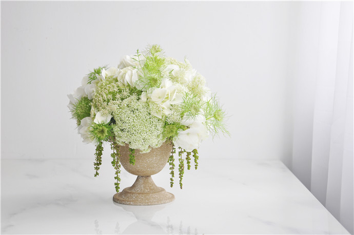 将白色绣球剪成小枝,对作品进行最后的补充,让作品整体更加饱满丰盈.