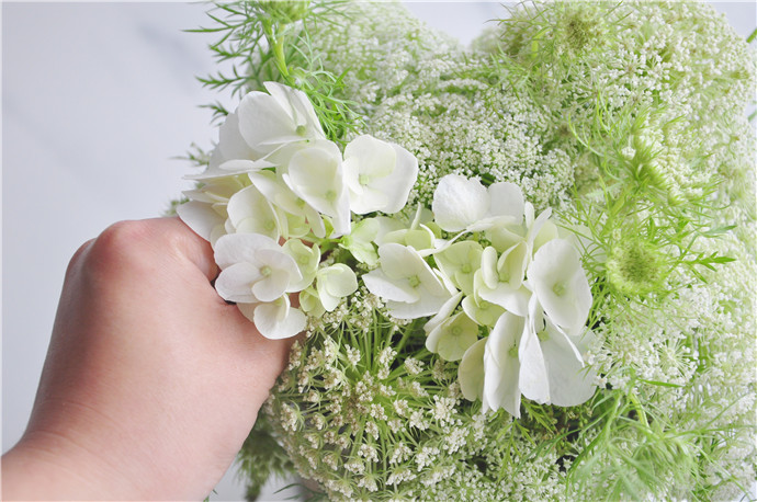 准备花材:蕾丝和白绣球为花市采购,野生山葡萄花是山间的野生植物,也可以用其他具有垂坠感的花材代替,如佛珠、绿色柔丽丝等.