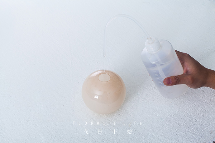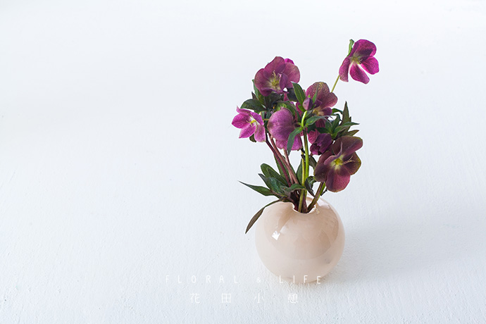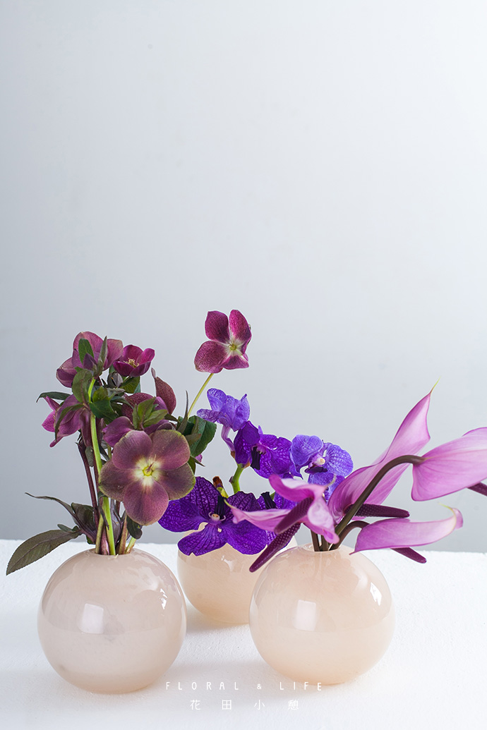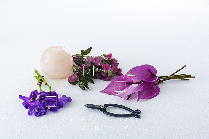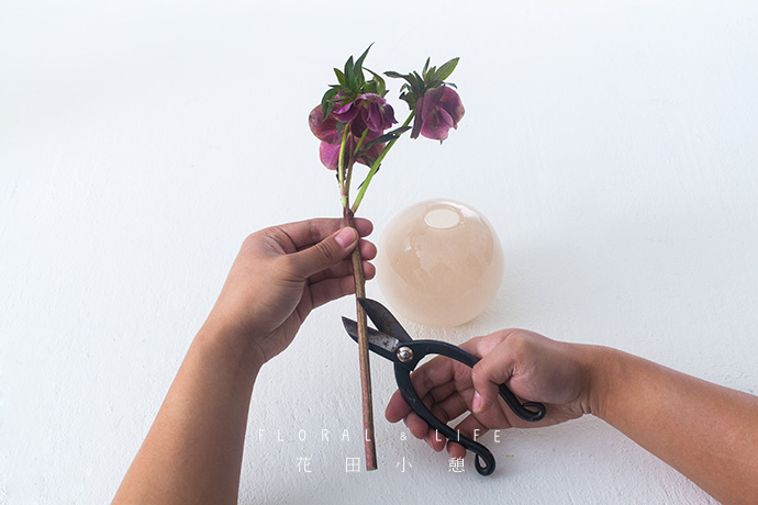 花材与花器间的良好比例,可让作品看起来更加舒服。将2-3支铁线莲插入到圆形花器中,保证花材间的疏密相间,保持作品整体造型的平稳感。