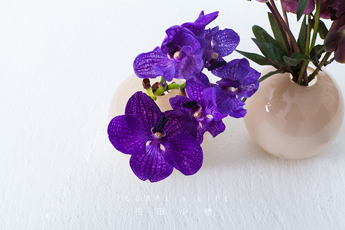 在花艺创作中,不同的花材可相互调和突出整体。在花器中插入鲜艳亮丽的万代兰,保持与其他花枝的色调一致,给人以清新、自然之感。
