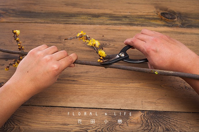 瓶插花内的花材需保持整洁、统一性,可进行适当的裁剪。根据作品所需的长度,去除腊梅根茎部位多余的花枝,逐步完善花材的造型,呈现挺直优雅的线条美。