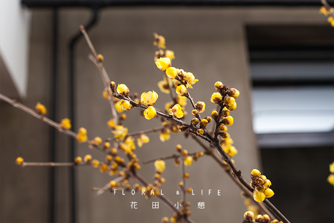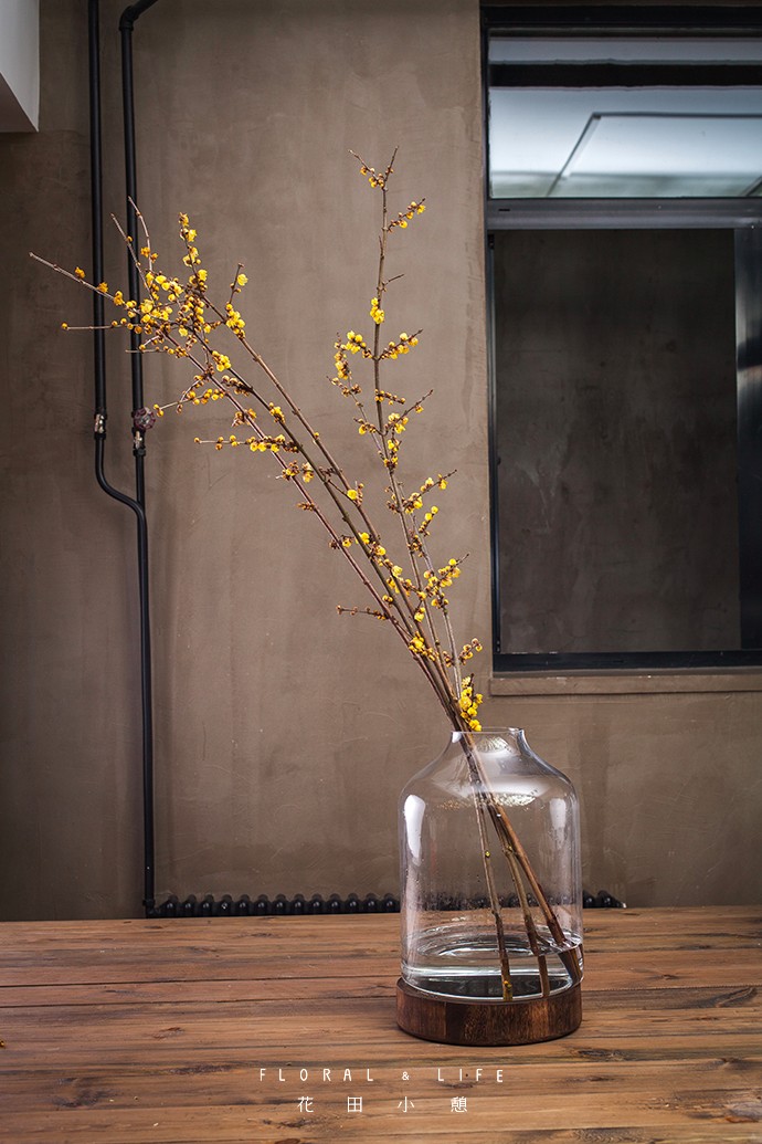 1.本次作品中,以冬季特有的腊梅进行简易插制,淡雅之中呈现出“早梅迎春”之意。腊梅作为传统名贵观赏花木,置于家居一隅,以黄花枝桠相映成趣,营造出风雅别致的庭中一景。