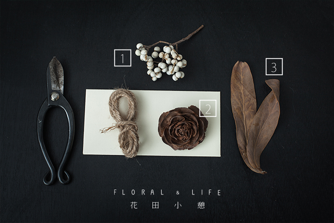 - 作品配色 -1.本次作品中,深棕色的松果和帝王花叶,是一种年华逝去才有的温馨色泽。而以小米花装点其间,如同满天星辰闪耀,仿佛夜空中最灿烂的微笑,让心情也跟