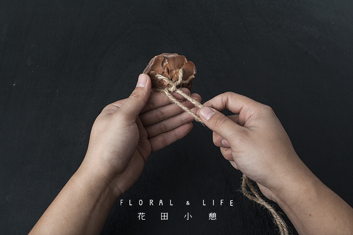 花材通过用织带、花边或者不同质地的绳子进行装饰,会得到意想不到的效果。像松果这类质地坚硬的花材,可用麻绳穿过松果保持统一的质感,绕缠底部一圈再固定好即可。