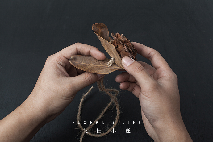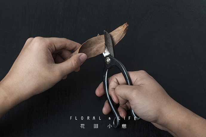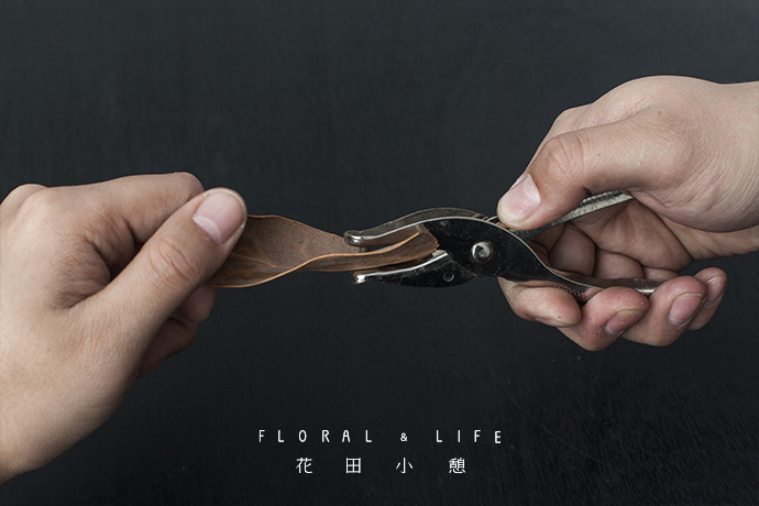 用打孔钳在叶片尾部添加一个圆孔,便于麻绳进行捆系。而制作过程中需拈轻去重,避免损坏花材的自然特征。